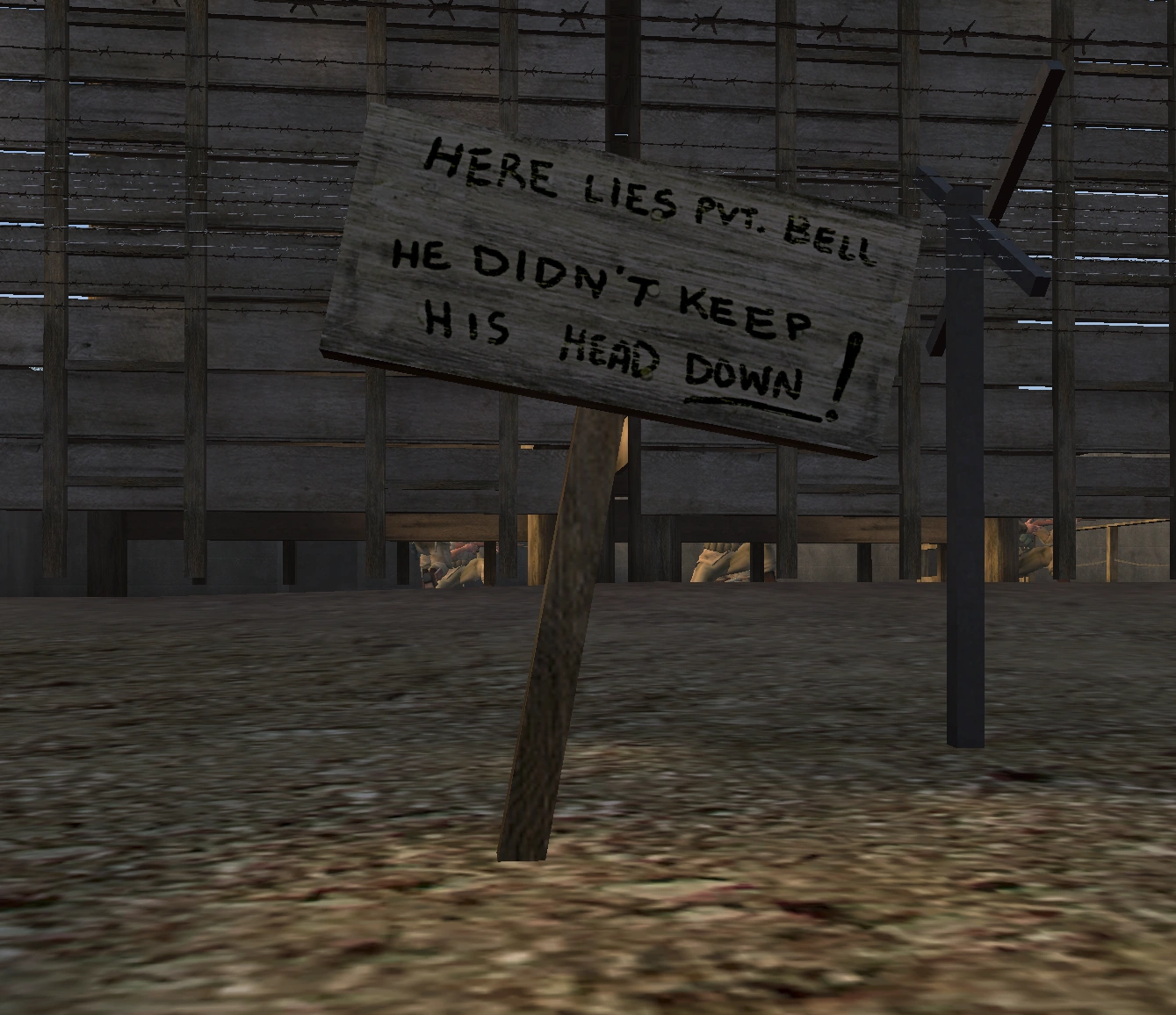 - I krypande området finns en skylt med texten: "Here lies Pvt. Bell he didn't keep his head down!" ("Här vilar menige Bell han duckade inte!").